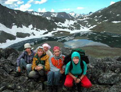 Верховья речки Северной Народы – царство снега и льда. Справа высится серая громада – это пик Карпинского, вторая по высоте гора Приполярного Урала. По высоте (1878 м) эта гора уступает Народной всего на 12 м. Спуск – переправа через реку - подъем на перевал – опять спуск… День заканчивается, и все уже порядком устали. Последний подъем - по ручью Карпин-шор, вытекающему из Голубого озера, лежащего прямо под Народной. Берега ручья заболочены, тропы нет, идем прямо по руслу, по большим камням. Навстречу на фоне закатного неба поднимается громада Народной. Голубое озеро, куда доходим к ночи, поражает великолепным видом и обилием комаров. На что уж мы привыкли к этим братьям меньшим, но такого …. Очевидно, здесь водится какой-то особый евроазиатский вид, суперагрессивный и суперустойчивый ко всем видам антимоскитной косметики. Комары не только успешно пытаются пополнить ваш рацион, покрывая толстым слоем содержимое мисок и кружек, но и, что гораздо хуже, настырно лезут в объектив фотоаппарата, оставляя на роскошных пейзажах черные злые мазки.