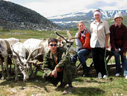 Чум оленеводов сейчас стоит как раз под Еркусеем; неподалеку пасется стадо ездовых быков. Особое внимание привлекла стоящая неподалеку упряжка оленей: все немедленно кидаются фотографироваться.