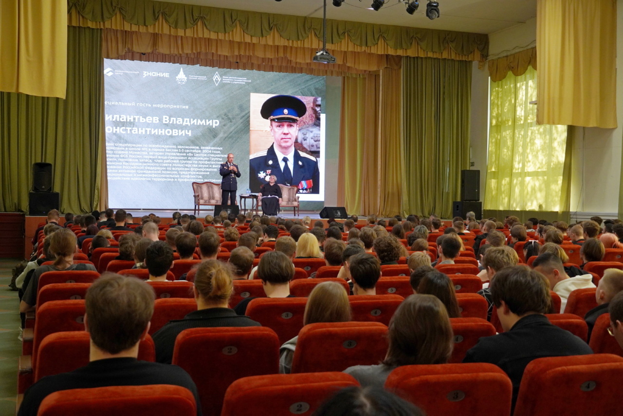 Четвертого сентября более ста студентов приняли участие в открытом диалоге с выдающимся представителем спецподразделений России. Главным гостем мероприятия стал Владимир Константинович Силантьев — кавалер ордена Мужества, ветеран Управления «В» Центра специального назначения ФСБ России, первый вице-президент Ассоциации Группы «Вымпел» и полковник запаса. Он лично участвовал в спецоперации по освобождению заложников во время трагических событий в Беслане.