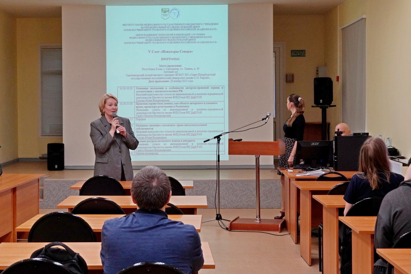 В рамках мероприятия выступили Наталья Владимировна Гарбуз, начальник отдела по инновационной и патентно-юридической деятельности Института химии ФИЦ Коми НЦ УрО РАН, совместно с Юлией Владимировной Комовой, ведущим юристом-консультантом отдела по инновационной и патентно-юридической деятельности ФИЦ Коми НЦ УрО РАН.