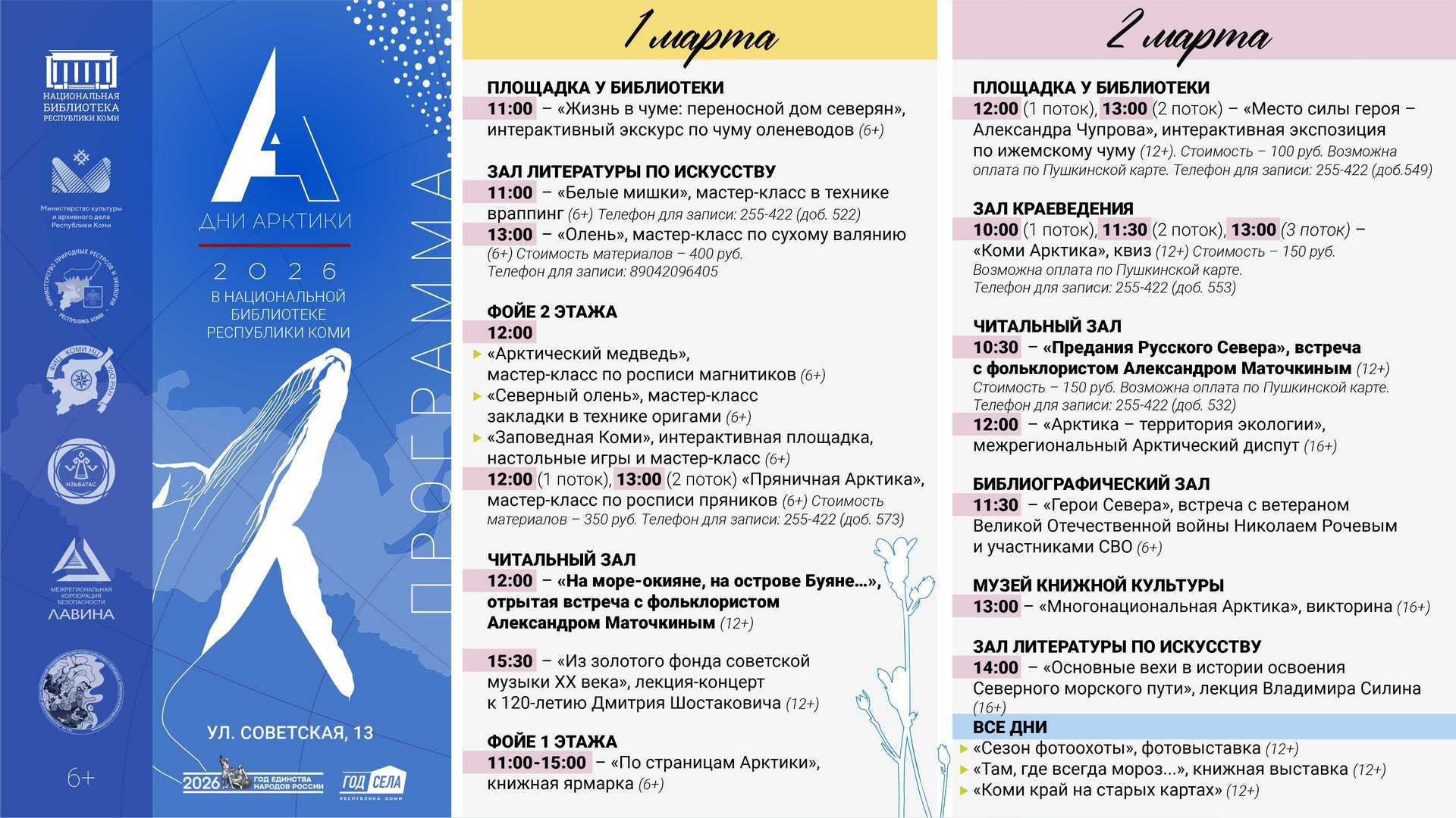 В воскресенье, 1 марта, посетителям увидят уникальную площадку, расположенную рядом с библиотекой, где будет представлена живая экспозиция традиционного жилища коми ижемцев и интерактивный экскурс по устройству чума оленеводов. В самой библиотеке будет работать площадка с настольными играми и творческими занятиями для детей и взрослых по изготовлению сувениров, вдохновленных природой севера. Также в первый арктический день состоится концерт памяти великого композитора XX века Дмитрия Шостаковича, чьи произведения получили мировое признание и продолжают звучать в наши дни.