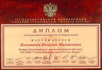 Почетным дипломом за вклад в развитие экономического потенциала России на III Всероссийской Конференции "Сильный руководитель – сильная Россия" награжден директор Сыктывкарского лесного института (филиал) Санкт-Петербургской государственной лесотехнической академии им. С.М. Кирова, профессор Н.М.Большаков.