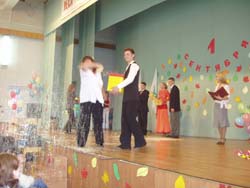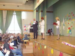 Закончилась торжественная часть вручением "ключа знаний" трем первокурсникам, набравшим при поступлении наибольшее количество баллов, выносом под студенческий гимн флага института и многоцветным фейерверком.