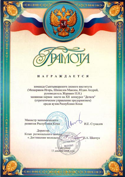Команда студентов Сыктывкарского лесного института заняла первое место в XII Республиканском конкурсе «Дельта» (стратегическое управление предприятием) среди высших учебных заведений республики, который прошел 12-13 декабря на базе Сыктывкарского госуниверситета.