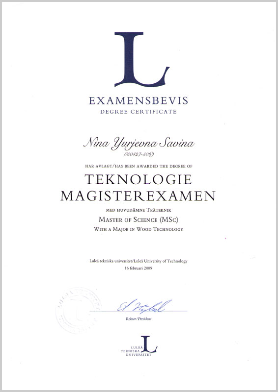 Сегодня мы рады получить результат: Нина Савина, выпускница СЛИ 2007 года по специальности «Менеджмент организации», успешно защитила шведский диплом. Это яркий пример того, как целеустремленность и тяга к знаниям постепенно приводят к успеху и делают на первый взгляд сложное дело возможным. Теперь у Нины, имеющей сразу два диплома: русский и европейский, – на наш взгляд, значительно расширились возможности трудоустройства. Мы поздравляем Нину и желаем ей удачи! Дерзайте, и вы, уважаемые студенты Лесного института, учитесь, стремитесь, все в ваших руках!