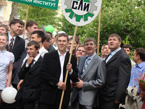 В сквере СЛИ прошла торжественная линейка. Сначала для выпускников прозвучал Gaudeamus. В этом году его исполнил «вживую» Григорий Вечерский. Соло на гитаре с козырька крыльца института присутствующие приняли на «ура». Потом, как символ прощания со студенчеством, в небо полетели воздушные шары.