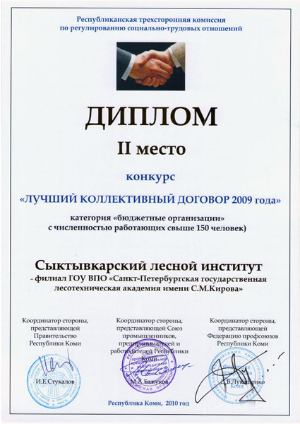 Сыктывкарскому лесному институту присуждено второе место в республиканском конкурсе на лучший коллективный договор 2009 года в категории «Бюджетные организации», численность которых превышает более 150 человек. Такое решение было принято Министерством экономического развития РК. Четвертый раз члены республиканской трехсторонней комиссии по регулированию социально-трудовых отношений собираются в малом зале администрации Главы республики для вручения наград победителям с момента учреждения этого конкурса. Цель данного мероприятия – распространение положительного опыта совместной работы руководства предприятий, организаций и профсоюзов по проведению социальной политики в коллективах и защите прав работников.