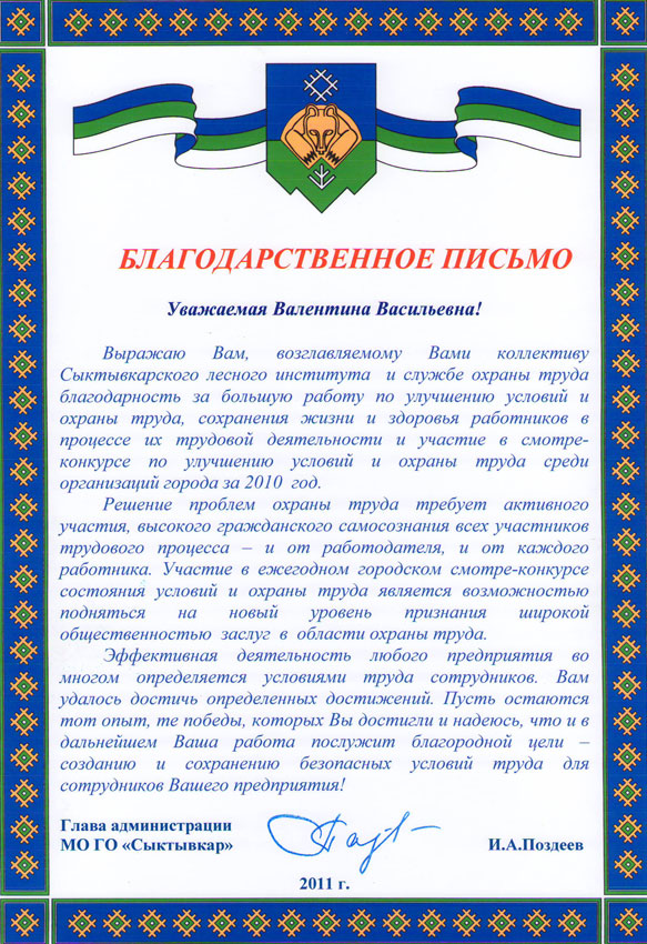 Глава администрации МО ГО «Сыктывкар» Иван Поздеев направил на имя директора Лесного института Валентины Жиделевой Благодарственное письмо. В нем он выразил признательность «за большую работу по улучшению условий и охраны труда, сохранению жизни и здоровья работников в процессе их трудовой деятельности и участие в смотре-конкурсе по улучшению условий и охраны труда среди организаций города за 2010 год».