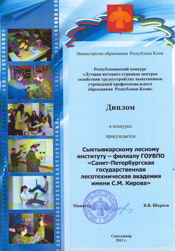 Министерство образования Республики Коми подвело итоги республиканского конкурса лучших интернет-страниц Центров содействия трудоустройства выпускников учреждений профессионального образования региона. В нем приняли участие 22 учреждения профессионального образования РК всех уровней. Экспертное жюри отметило высокий уровень оформления, технической оснащенности и информационное сопровождение интернет-страниц вузов, техникумов и колледжей. В число шести лучших вошел и Сыктывкарский лесной институт. Его работа в этом направлении отмечена Дипломом Министерства образования Республики Коми.