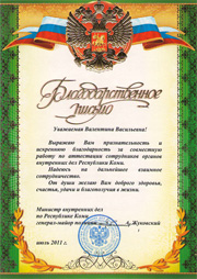 Сегодня в адрес директора СЛИ профессора Валентины Жиделевой пришло Благодарственное письмо из Министерства внутренних дел по Республике Коми. В нем выражается признательность и искренняя благодарность за совместную работу по аттестации сотрудников, в которой Валентина Васильевна принимает участие в течение полутора месяцев, начиная с июня текущего года. В состав аттестационной комиссии она вошла как член Общественного совета при региональной силовой структуре.