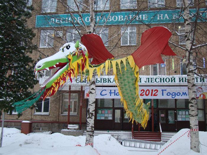 На Стефановской площади прошел парад Дедов Морозов и зажгли Главную елку республики. В городском конкурсе новогоднего оформления зданий дипломом администрации г. Сыктывкара среди победителей в этот день был отмечен и Лесной институт.