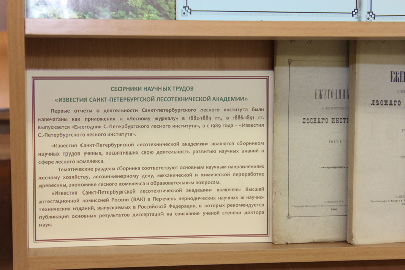 На ней были представлены созданные в течение многих и многих лет труды преподавателей и ученых не только Лесного института, но и нашего головного вуза — Санкт-Петербургского государственного лесотехнического университета, материалы конференций и других научных форумов. Они едва разместились на шести стендах выставки в читальном зале библиотеки СЛИ.