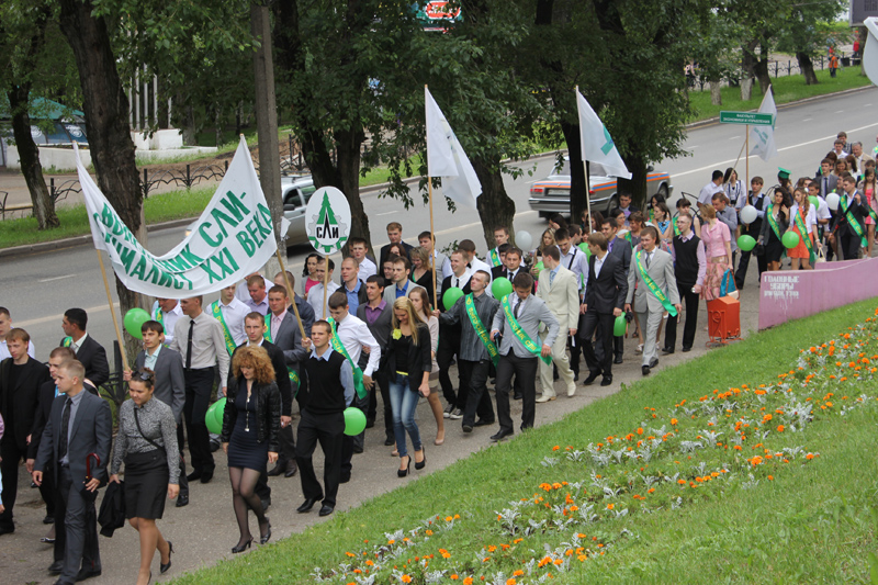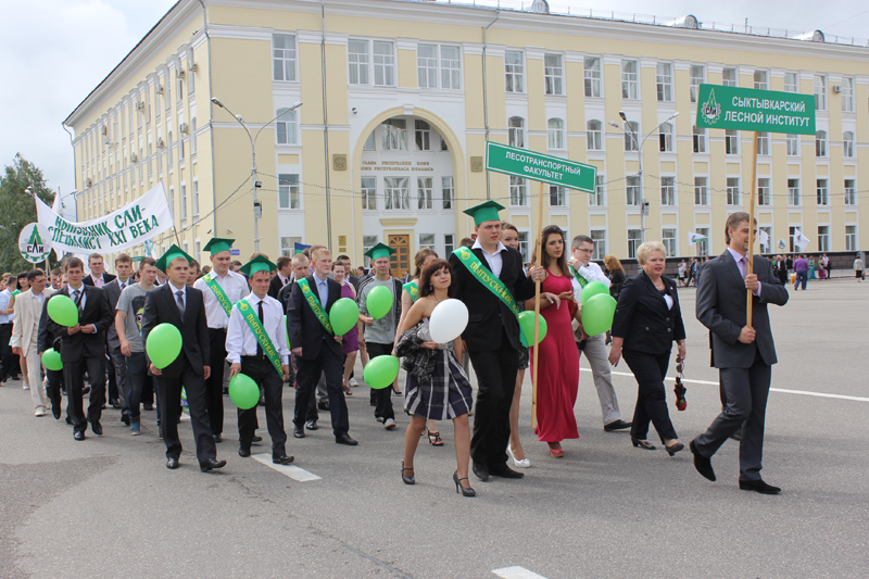Традиционным шествием от Театральной площади начался последний день студенчества для его выпускников. Понятные чувства радости и грусти испытывали они, их преподаватели и наставники, когда они колонной торжественно проходили по Коммунистической, возлагали цветы к Вечному огню и выходили на Стефановскую площадь. Здесь к колонне выпускников присоединились Председатель Госсовета РК Марина Истиховская и глава администрации Сыктывкара Иван Поздеев.