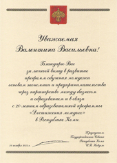 В торжественной обстановке большой группе тех, кто стоял у истоков республиканской организации «Достижения молодых» и содействовал ее развитию, вручили различные награды. Среди них — директор СЛИ профессор Валентина Жиделева, которая была удостоена благодарственного письма председателя Госсовета РК Игоря Ковзеля и благодарностей академика РАН Евгения Велихова, руководителя Всероссийской организации «Достижения молодых».