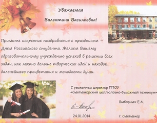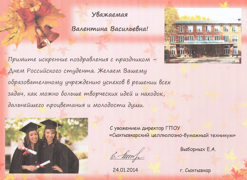 Примите искренние поздравления с праздником – Днем Российского студента. Желаем Вашему образовательному учреждению успехов в решении всех задач, как можно больше творческих идей и находок, дальнейшего процветания и молодости души.