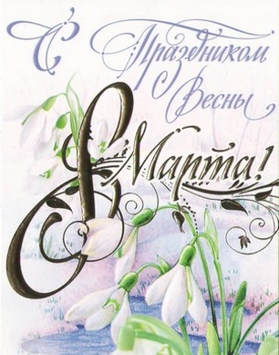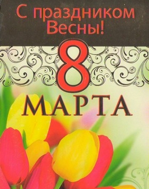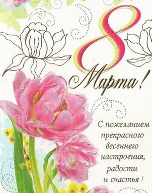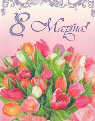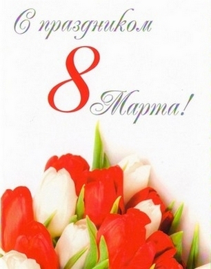 Пусть самый радостный день Весны, 8 Марта, принесет Вам только самое хорошее, пусть сбываются все ваши мечты, пусть мир и согласие всегда сопровождают вас, пусть тепло этого праздника согреет душу и сердце, защитит от невзгод и тревог, подарит радость от общения с друзьями и близкими.