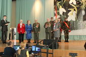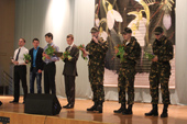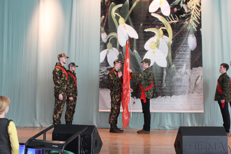 По поручению Коми республиканской академии госслужбы и управления группа знаменоносцев вместе с Фяргией Суркиной - проректором по учебной и воспитательной работе, под звуки гимна Преображенского полка вынесла копию легендарного знамени для передачи его СЛИ.