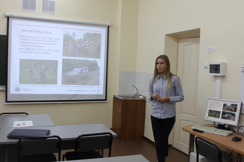 Презентацией по итогам проделанной работы завершила двухмесячную стажировку, проходившую на базе Сыктывкарского лесного института в рамках международной программы Master’s Degree Programme in CBU Forestry, студентка из Финляндии - Татьяна Дюкова.