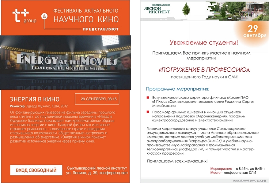 Среди партнеров фестиваля – Русское географическое общество и крупнейшие компании страны, в том числе ПАО «Т Плюс». При его поддержке в рамках фестиваля в вузах Коми будут показаны лучшие документальные фильмы о науке. И первым участником проекта в РК стал Сыктывкарский лесной институт. Студентам IV курса СЛИ, а также приглашенным учащимся Сыктывкарского индустриального колледжа (он входит в Лесной образовательный кластер РК) покажут ленту «Энергия в кино».
