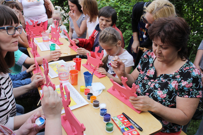 Целый ряд деревянных заготовок оленей кораллового цвета ждал своего часа, для того, чтобы превратиться в сказочных героев в наряде с национальным орнаментом, в который через несколько минут их «одели» художники-любители, младшему из которых было всего четыре года.