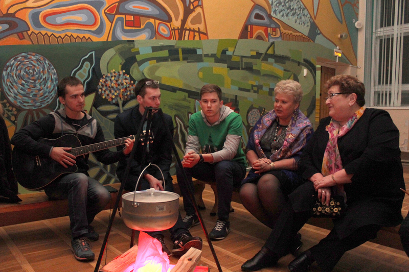 Особая атмосфера царила в актовом зале института, которым на время завладели барды, поющие под гитару и свирели птиц у костра. Среди них были замечены учащиеся лицея народной дипломатии с преподавателем Еленой Костровской. Сюда к ним, на 4 этаж, после посещения площадок поднялись зам. председателя Госсовета РК Валентина Жиделева и директор СЛИ Любовь Гурьева, поклонницы Визбора и студенческих песен. Они поблагодарили ребят за организацию акции, и посоветовали проводить её, как можно чаще.