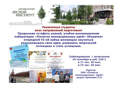 Уважаемые студенты всех направлений подготовки! Продолжая эстафету знаний, учебно-инновационная лаборатория «Полигон инновационных идей» объявляет очередной VI-ой набор