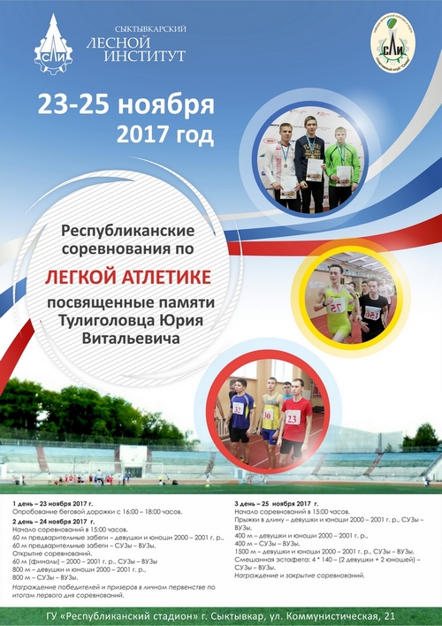 Дополнительную информацию о предстоящих соревнованиях можно узнать из Положения «О традиционных республиканских соревнованиях по легкой атлетике, посвященных памяти первого заведующего кафедрой физического воспитания Сыктывкарского лесного института Тулиголовца Юрия Витальевича» (DOC, 48 КБ).