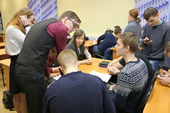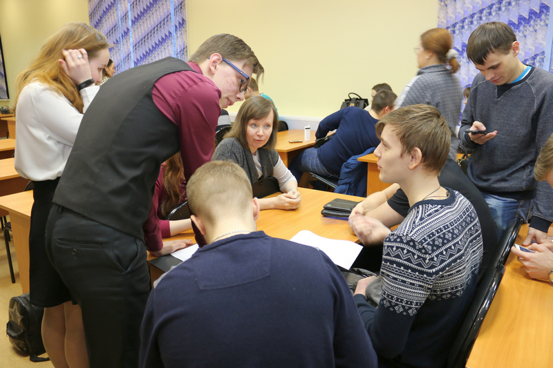 Затем ребята, среди которых были гости института с автомеханического техникума, посмотрели документальный фильм о российской науке и этапах ее становления. Аудитория разделилась на команды, каждая из которых получила задание: раскрыть тему прошлого, настоящего и будущего науки. Скоординировать работу в группах помогли модераторы из числа студентов-активистов СЛИ.