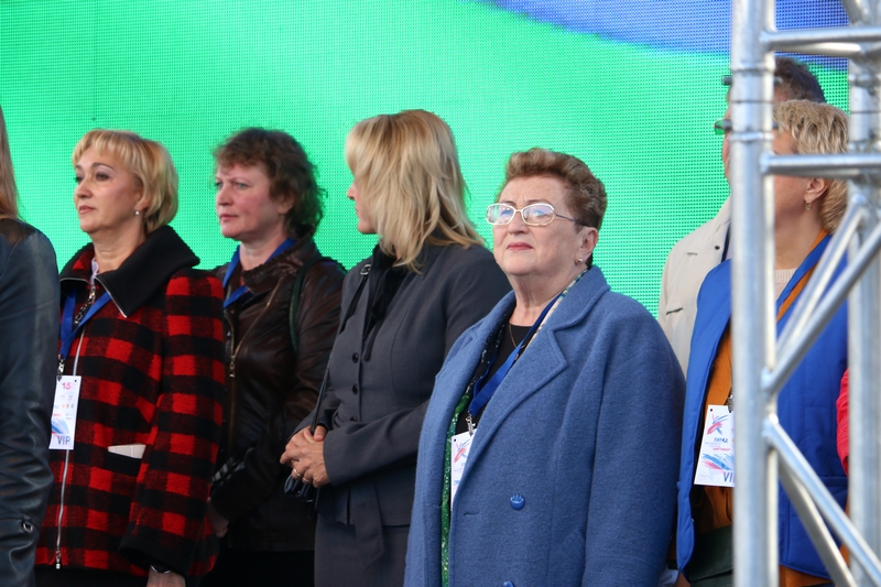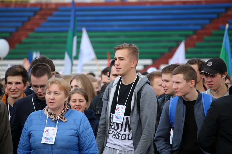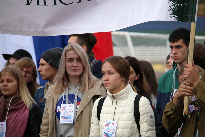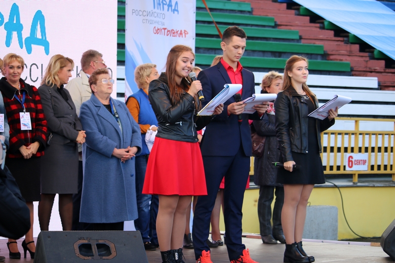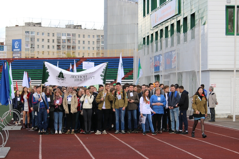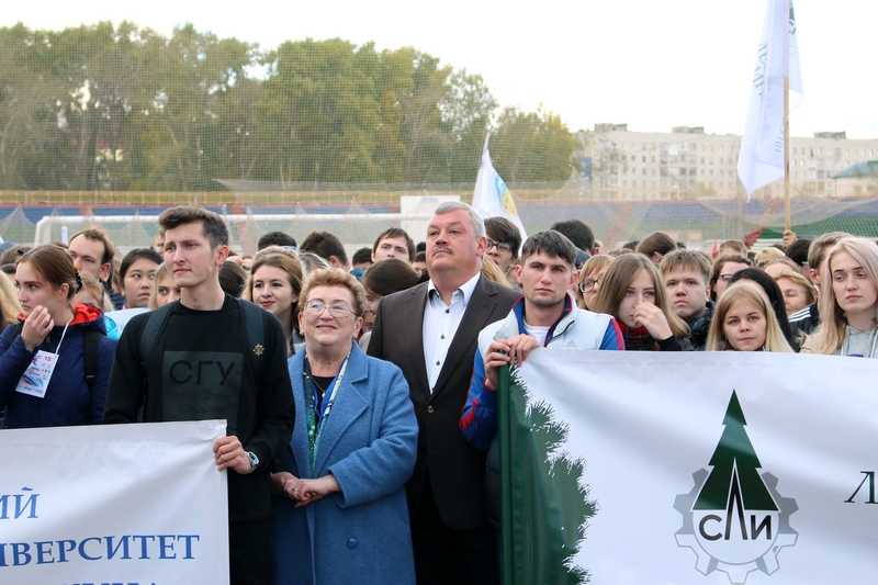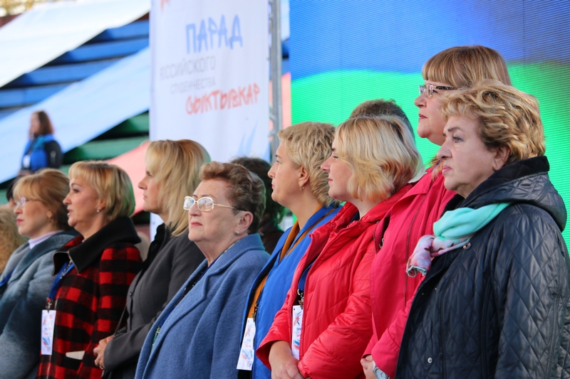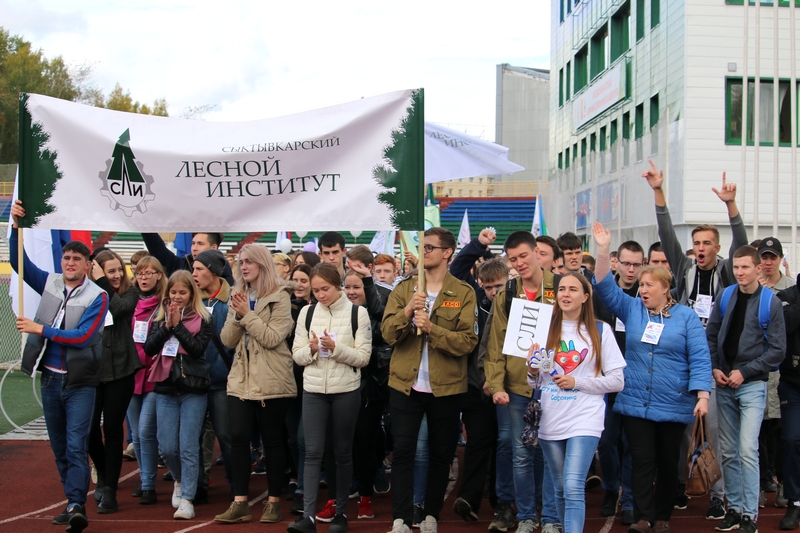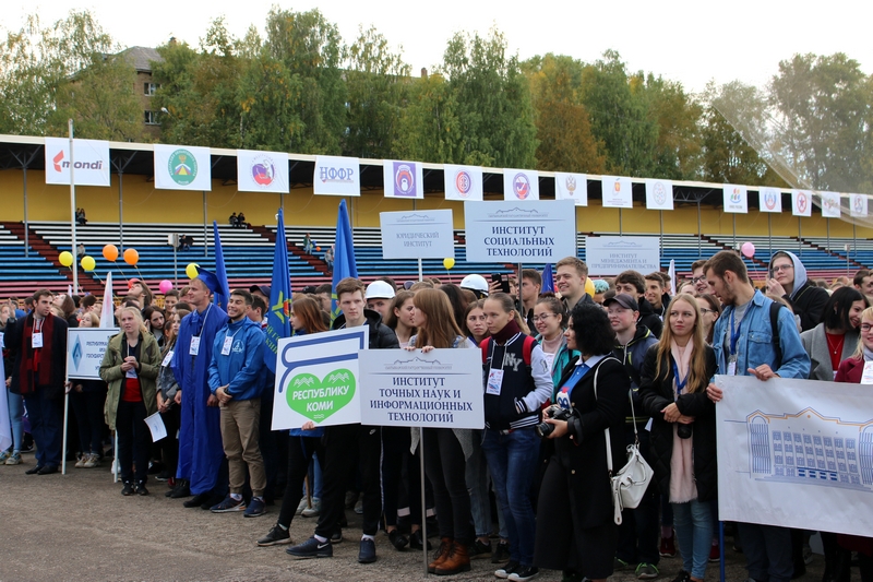Стартовал большой студенческий парад с шествия первокурсников. Новоиспеченные студенты СЛИ гордо пронесли по кольцу Республиканского стадиона штандарт своего вуза. Сопроводила своих подопечных и директор СЛИ Любовь Гурьева. Всего в шествии приняло участие 18 учебных заведений из Сыктывкара и Ухты.