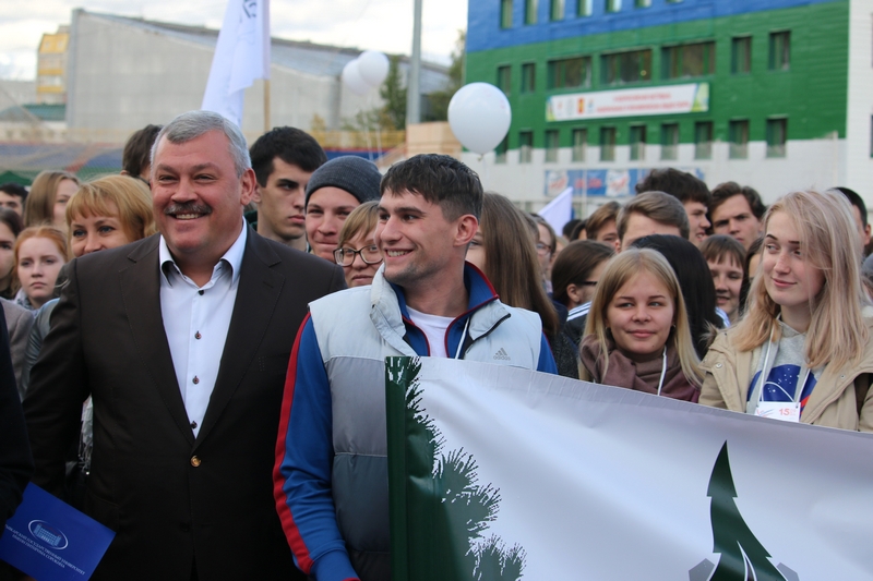 Сергей Гапликов встал в ряды первокурсников, разместившись возле колонны Сыктывкарского лесного института - ведущего отраслевого вуза Республики Коми.