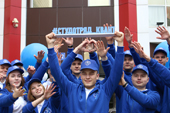 После ребята зажигательно исполнили песню отряда, а также получили подарки от компании - синие рюкзаки в корпоративном стиле.