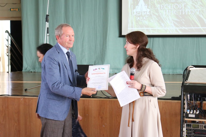 Поприветствовал первый отраслевой вуз региона и Председатель профсоюза работников лесных отраслей Александр Смирнов, вручив благодарности российского и регионального уровня сотрудникам и отметив студентов-стипендиатов, которые в этом году будут получать стипендию профсоюза.