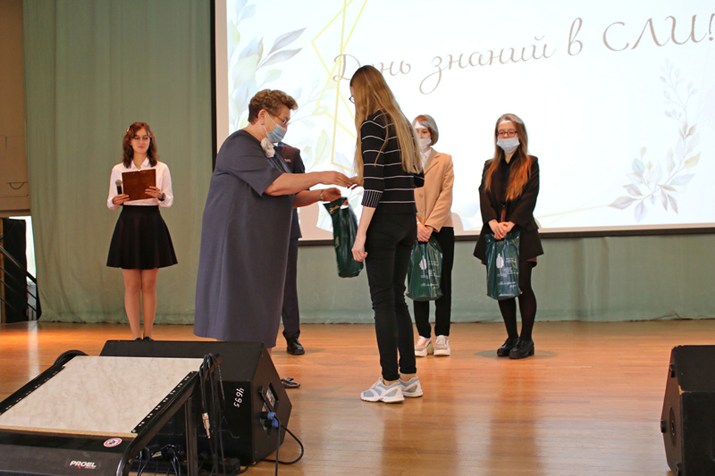 Директор СЛИ также поздравила и подарила полезные наборы 24-м студентам-высокобалльникам, у которых сумма баллов ЕГЭ варьировалась от 200 до 287, пожелала не останавливаться на достигнутом, а через четыре года на этой же сцене стоять уже профессионалами с красным дипломом.