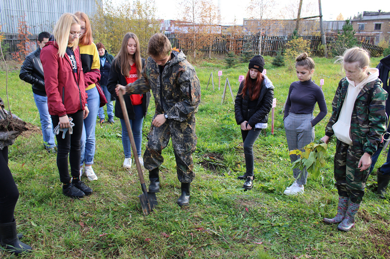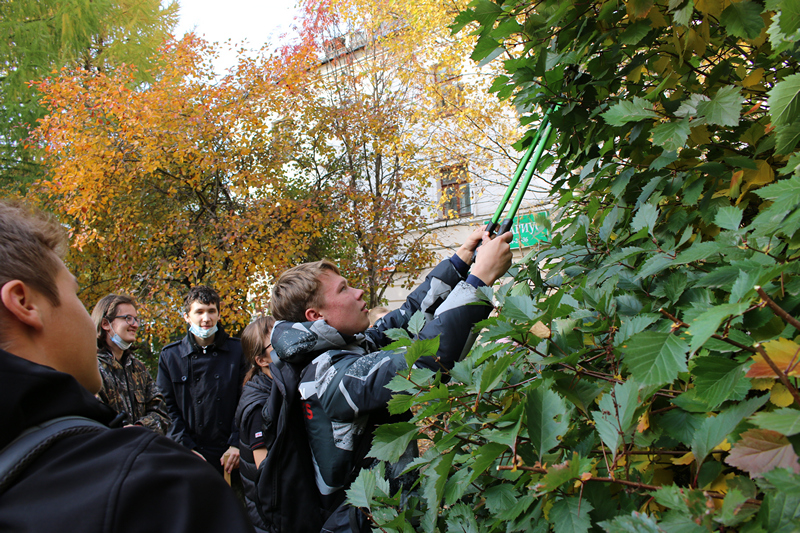 В сквере у входа в Сыктывкарский лесной институт юным лесоводам выдали необходимый инвентарь для подравнивания зеленых насаждений. Ребята активно избавлялись от сухих и торчащих веток калины и боярышника. Руководитель школы Людмила Дымова отметила, что уже по всему миру организации и люди отказываются от металлических и деревянных заборов в пользу кустарников, которые высаживаются по периметру зданий.
