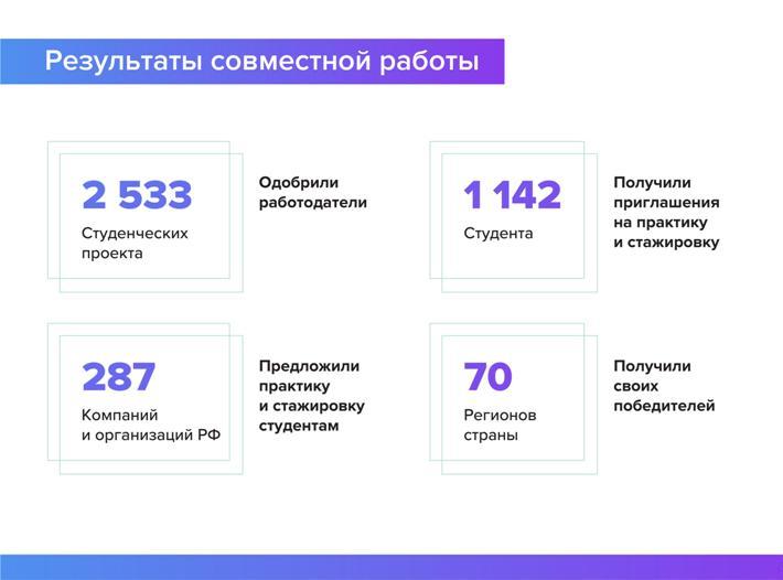 За год работы проект показал себя как эффективный инструмент сотрудничества образования и бизнеса, направленный на создание реальных социальных лифтов для молодежи России. На цифровой платформе «Профстажировки.рф» размещено более 4500 практических кейсов (заданий), осуществляется системное взаимодействие 1200 ведущих партнеров-работодателей и 110 тысяч студентов из более чем 2000 образовательных организаций, реализующих программы среднего профессионального и высшего образования, из всех регионов страны. В результате совместной работы работодатели одобрили 2533 студенческих проекта, 1142 студента из 70 регионов страны получили реальные приглашения на практики или стажировки в 287 компаниях и организациях Российской Федерации.