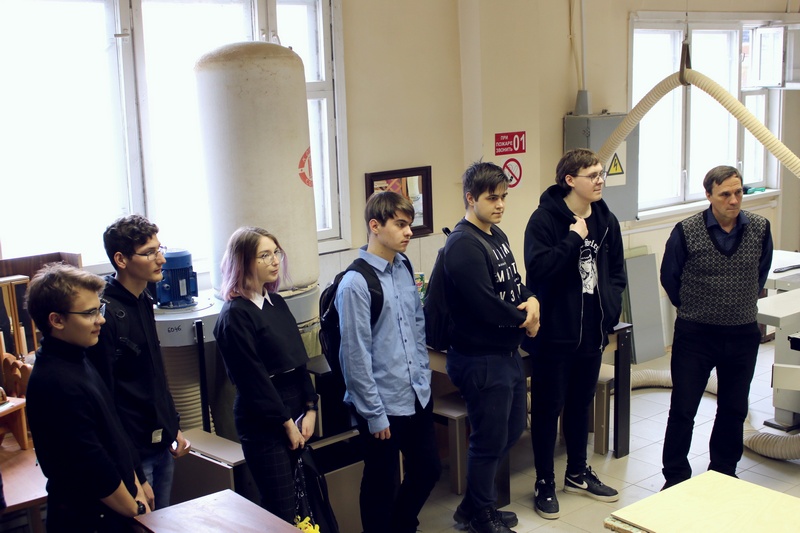 Экскурсия началась с посещения лабораторий «Компьютерное проектирование изделий из древесины и технологических процессов» и «Технология изготовления изделий из древесины». Преподаватель кафедры «Лесное хозяйство и деревообработка» Мария Кочева рассказала ребятам, чем занимаются студенты во время учебы и практики, принципы работы в лабораториях, показала оборудование и материалы.