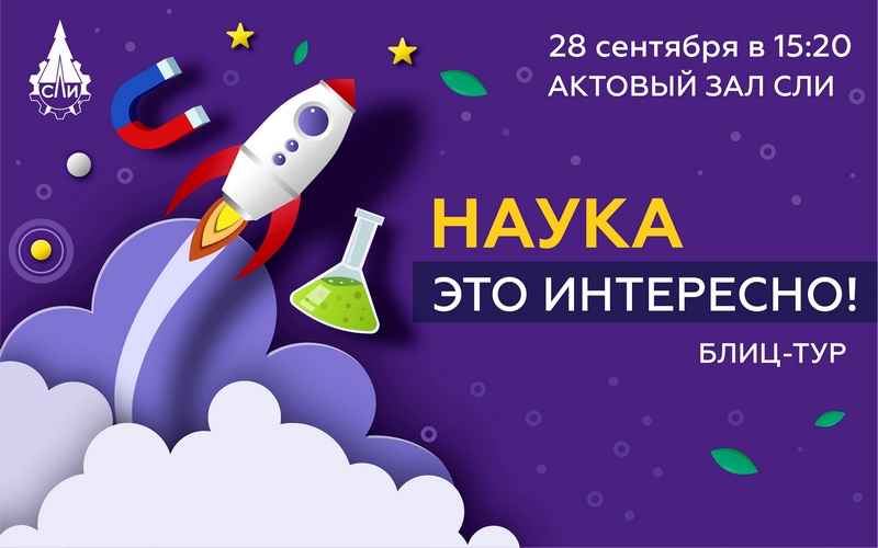 Уважаемые студенты! Приглашаем Вас 28 сентября 2021 года на блиц-тур «Наука - это интересно!», посвященном году науки и технологий. Начало в 15:20, аудитория - актовый зал Cыктывкарского лесного института.