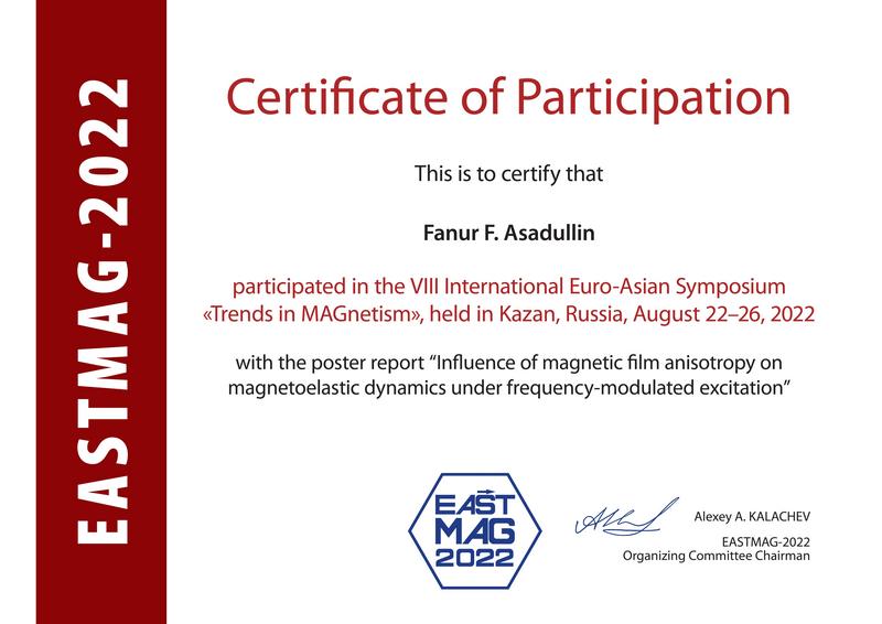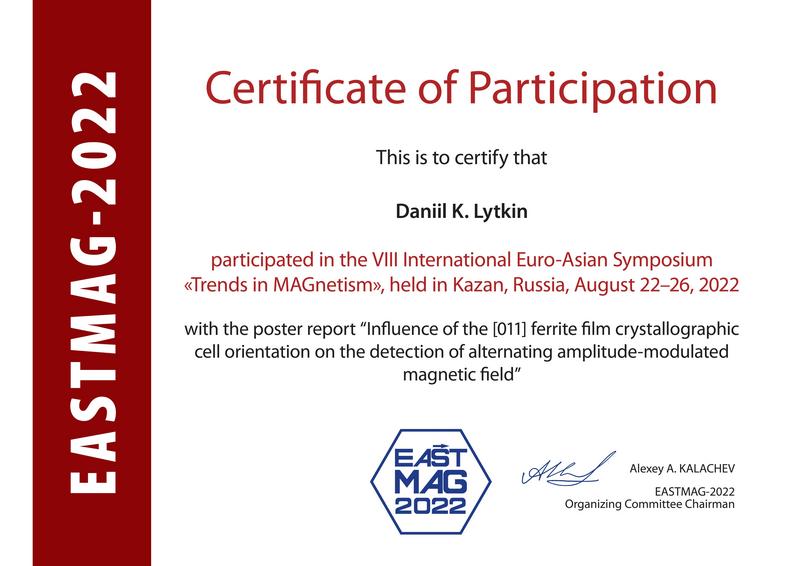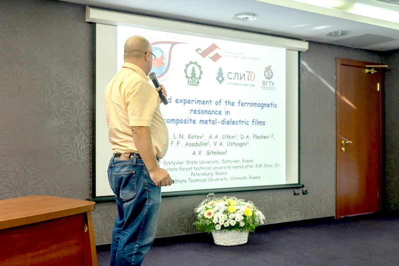Сыктывкарский лесной институт на международном симпозиуме представили два преподавателя и студента: заведующий кафедрой «Физика и автоматизация технологических процессов и производств», д.ф.-м.н., профессор Фанур Асадуллин, к.ф.-м.н., доцент кафедры ФиАТПиП Дмитрий Плешев, студенты третьего курса Даниил Лыткин и Михаил Филитов. Участники представили стендовые доклады на темы: «Влияние анизотропии магнитной пленки на магнитоупругую динамику при частотно-модулированном возбуждении», «Условия эффективного обнаружения частотно-модулированного переменного магнитного поля на основе магнитоупругих колебаний пленки YIG» и «Влияние ориентации кристаллографической ячейки на ферритовой пленке [011] на детектирование переменного амплитудно-модулированного магнитного поля».