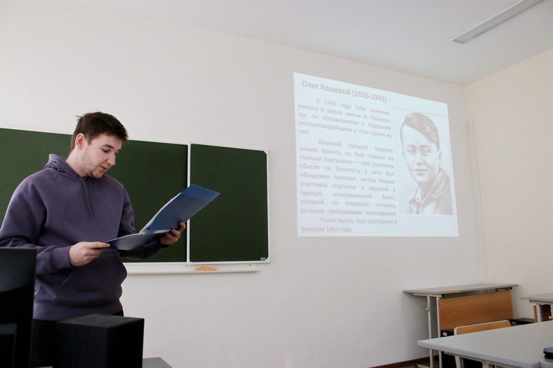 С докладом о подвигах Молодой гвардии выступил студент Лесного института Даниил Лыткин. За весь период своей деятельности организация «Молодая гвардия» выпустила и распространила в городе Краснодоне более пяти тысяч антифашистских листовок с данными о реальном положении дел на фронте и призывами к населению подниматься на беспощадную борьбу с немецкими оккупантами. Наряду с подпольщиками-коммунистами, члены организации участвовали в проведении диверсий в электромеханических мастерских города.