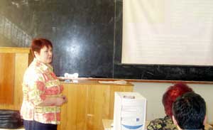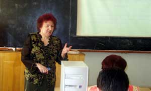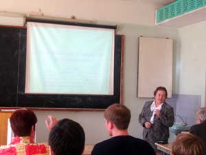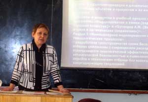 Заведующая кафедрой «Химии», к.х.н. Н.К. Политова, в своем выступлении рассказала об основных задачах класса «Информационные и образовательные технологии в химии», а также отметила, что "информатизация химического цикла играет значительную роль в естественнонаучном образовании будущих специалистов. Сегодня как никогда нужны высокообразованные инженеры для освоения и создания современных ресурсосберегающих технологий. Информационное обеспечение химических дисциплин позволяет интенсифицировать и индивидуализировать учебный процесс..."