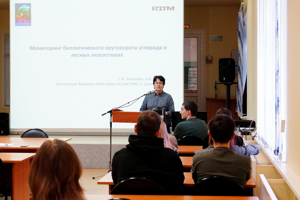 Ученые из Коми научного центра рассказали студентам СЛИ о мониторинге природных экосистем, круговороте углерода и изменении климата. Первый доклад представила Светлана Загирова, д. б. н., заведующая отделом Лесобиологических проблем Севера Института биологии ФИЦ КНЦ УрО РАН. Она рассказала, насколько важно в современных условиях изучать круговорот углерода, выступая с темой доклада «Углекислый газ – одна из основных причин глобального потепления и знания его природы помогут снизить парниковый эффект».