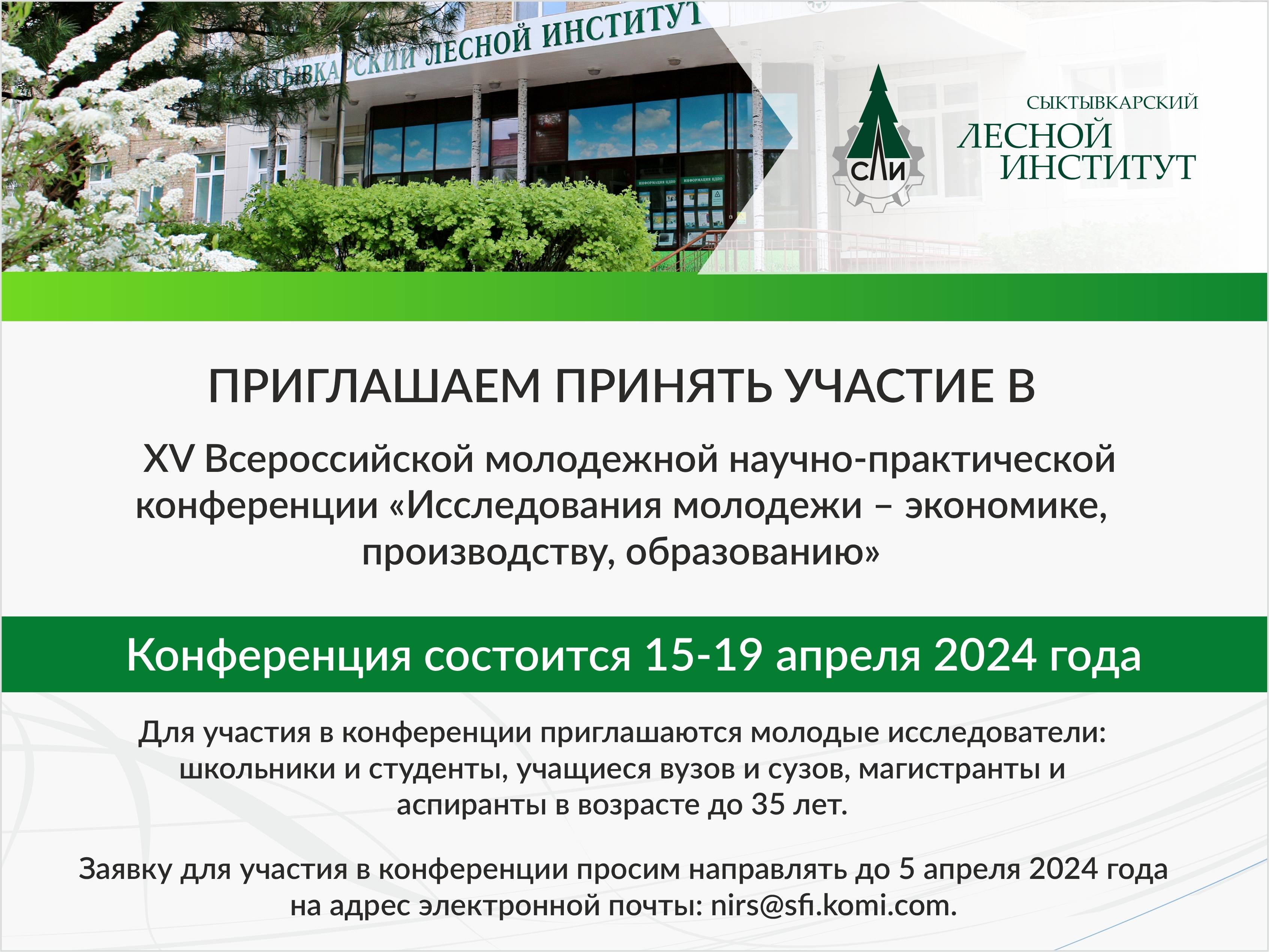Конференция состоится 15-19 апреля 2024 года на площадке Сыктывкарского лесного института (г. Сыктывкар, Республика Коми). Для участия в конференции приглашаются молодые исследователи: школьники и студенты, учащиеся вузов и сузов, магистранты и аспиранты в возрасте до 35 лет.