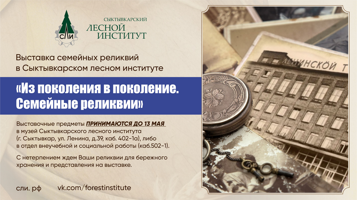 Выставочные предметы принимаются до 13 мая в музее Сыктывкарского лесного института (г. Сыктывкар, ул. Ленина, д.39, каб. 402-1а), либо их можно принести в отдел внеучебной и социальной работы (каб. 502-1).