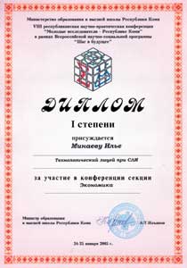 Отбор участников на эту конференцию проходил по результатам Восьмой Республиканской научно-практической конференции «Молодые исследователи –Республике Коми», которая проходила в рамках Всероссийской научно-социальной программы «Шаг в будущее» 24-25 января в г.Сыктывкаре. Тогда Илья стал победителем в секции «Экономика», награжден дипломом I степени.
