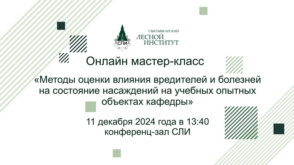 11 декабря 2024 года в 13:40 (конференц-зал СЛИ) состоится онлайн мастер-класс «Методы оценки влияния вредителей и болезней на состояние насаждений на учебных опытных объектах кафедры».