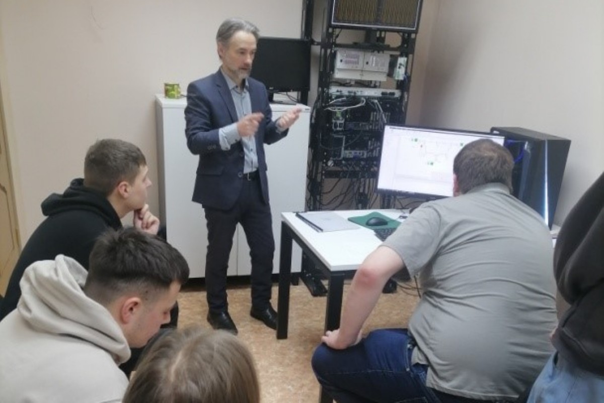 Заведующий лабораторией, кандидат технических наук Михаил Викторович Хохлов провел для студентов увлекательную экскурсию. Он рассказал о направлениях деятельности лаборатории и продемонстрировал работу программно-технического комплекса. Этот комплекс позволяет в режиме реального времени моделировать физические и информационные процессы в электроэнергетических системах.