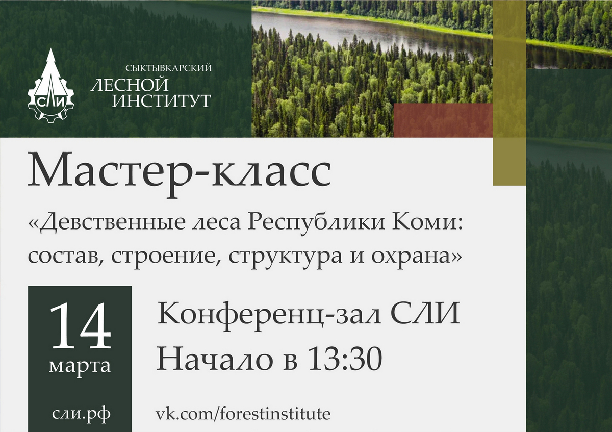 14 марта 2025 года в 13:30 (конференц-зал СЛИ) состоится онлайн мастер-класс «Девственные леса Республики Коми: состав, строение, структура и охрана».