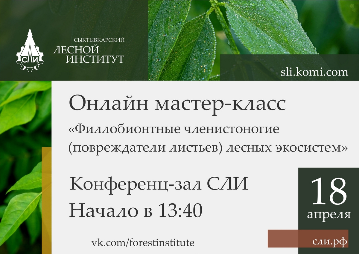18 апреля 2025 года в 13:40 (конференц-зал СЛИ) состоится онлайн лекция «Филлобионтные членистоногие (повреждатели листьев) лесных экосистем».