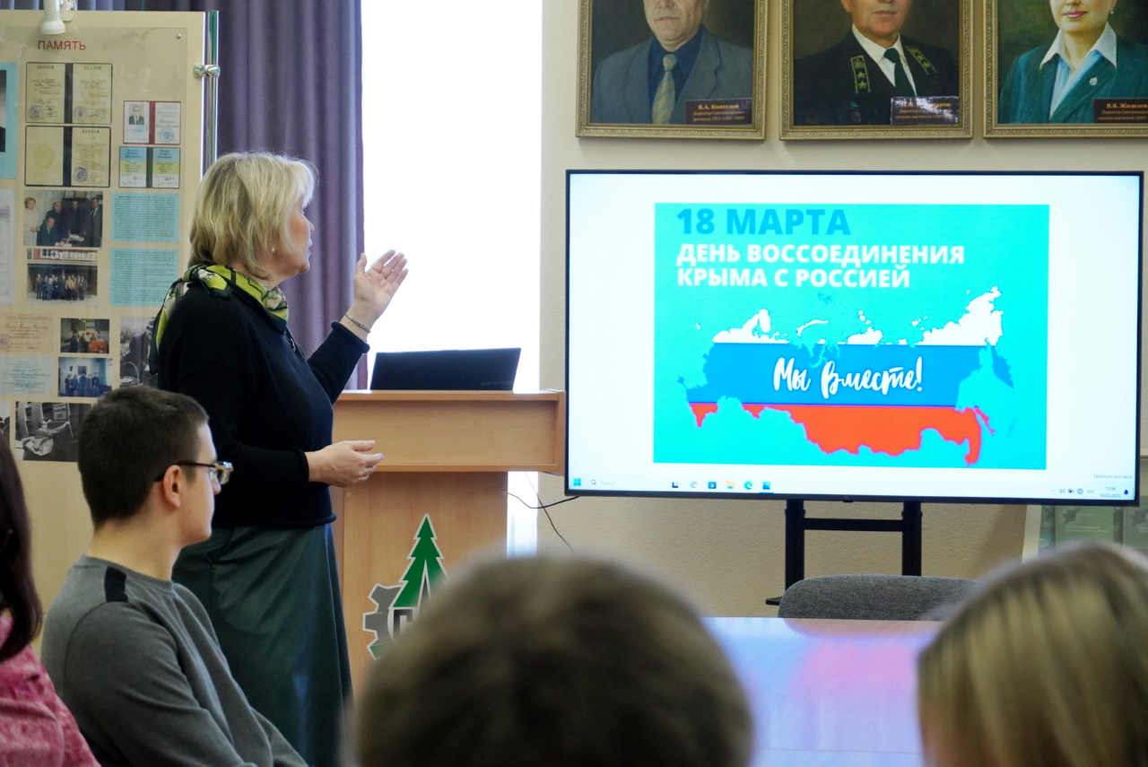 В Сыктывкарском лесном институте 18 марта, в рамках празднования Дня воссоединения Крыма с Российской Федерацией, прошла просветительская лекция. В ходе нее доцент кафедры «Экономика и управление», к.и.н. Татьяна Мартынчук обратила внимание на такое понятие, как «историческая амнезия», – когда правдивые факты из прошлого искажаются, а детали забываются у людей, что сопровождается исчезновением объективного социального суждения об их важности из культурной памяти. Студенты также посмотрели документальный фильм Российского общества «Знание» «Хронотоп. История присоединения Крыма», тем самым закрепили знания о роли Крыма в судьбе России.