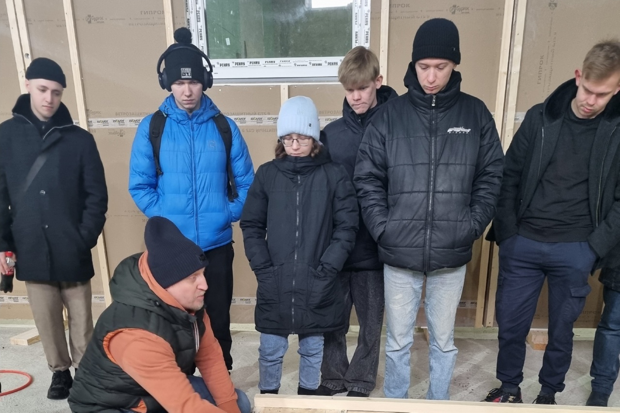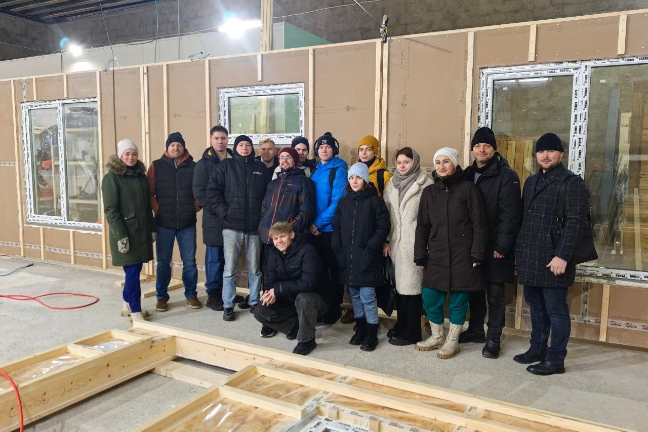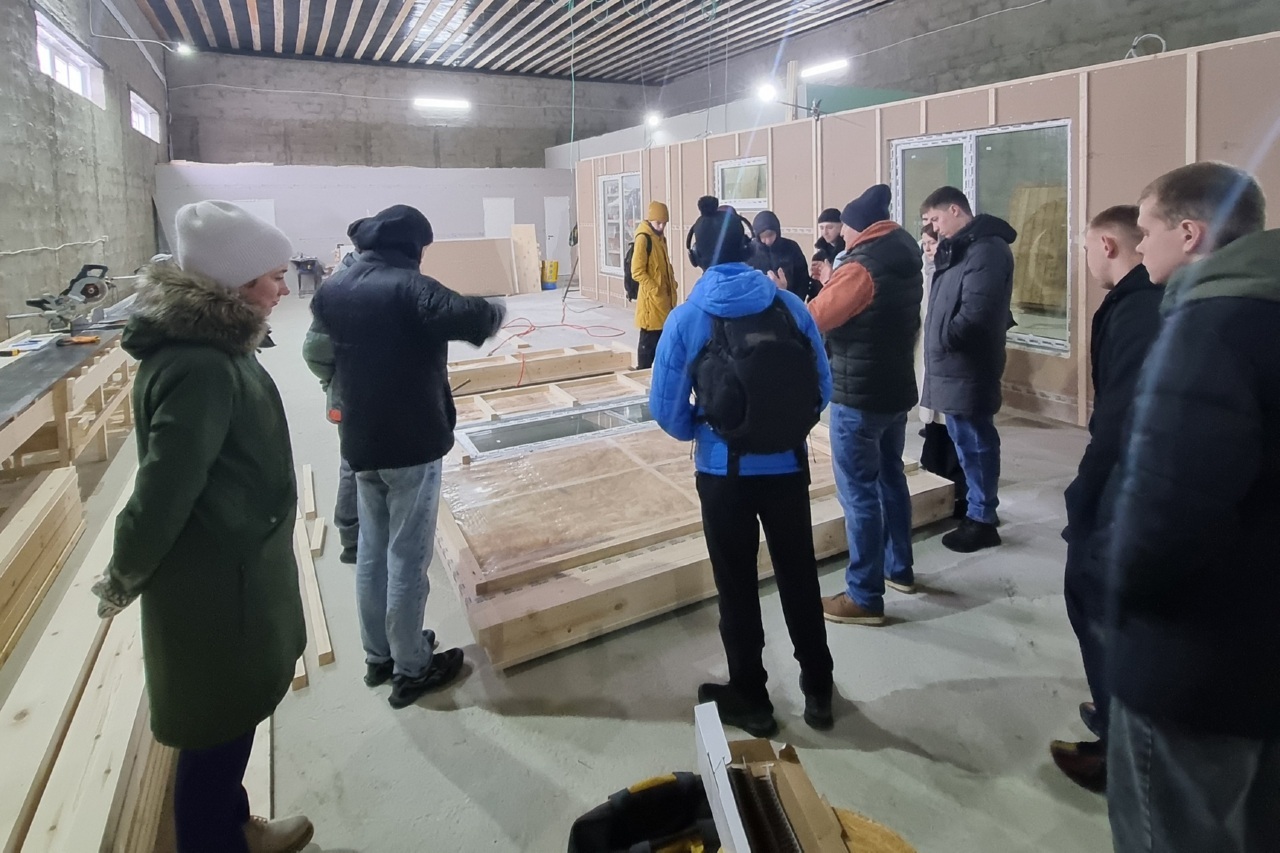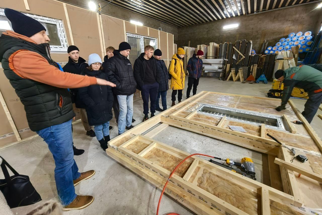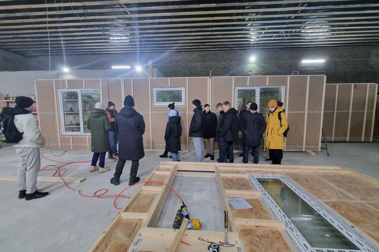 В ходе экскурсии студенты получили уникальную возможность увидеть все этапы производства: от изготовления стеновых и кровельных панелей до финальной сборки элементов. Им продемонстрировали процесс создания перекрытий с деревянным каркасом, установку окон и дверей, монтаж внешней и внутренней отделки, а также проведение электромонтажных работ.